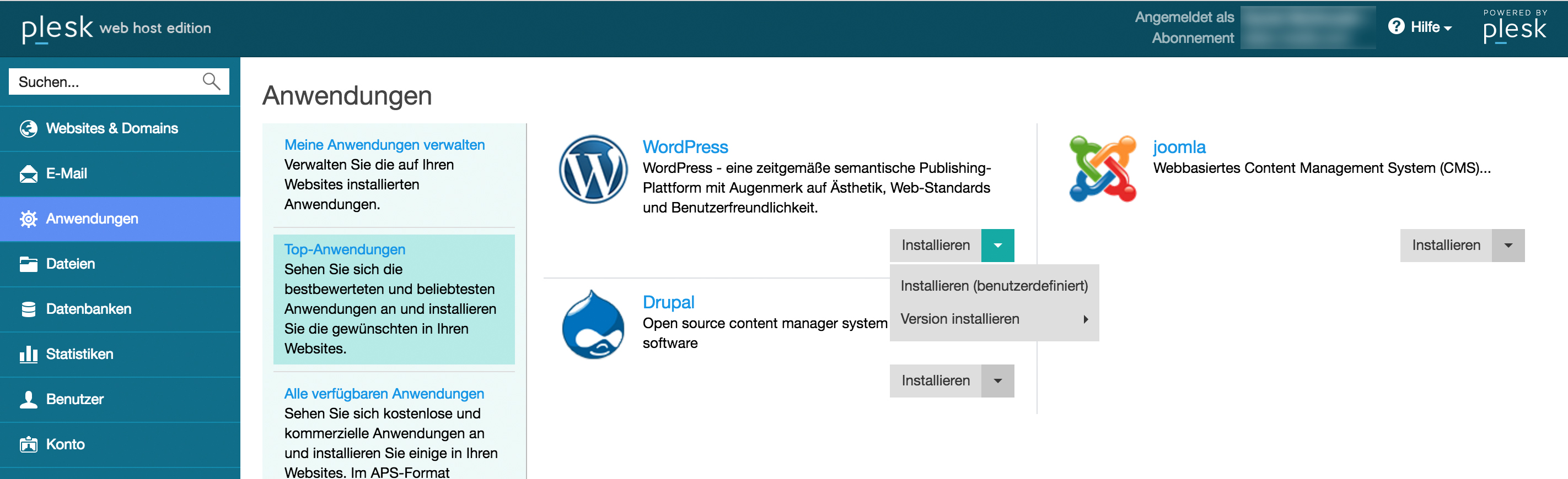 Um sich in einer WordPress Installation anzumelden, rufen Sie Websites & Domains > WordPress auf. Klicken Sie auf die Schaltfläche Anmelden, die zur gewünschten WordPress Installation gehört. Beachten Sie aber, dass Sie für manuell hinzugefügte WordPress Installationen den Administratorbenutzernamen und das zugehörige Passwort angeben müssen, es sei denn Sie geben diese vorher unter Websites & Domains > WordPress > Name der Installation > Zugangsdaten an.