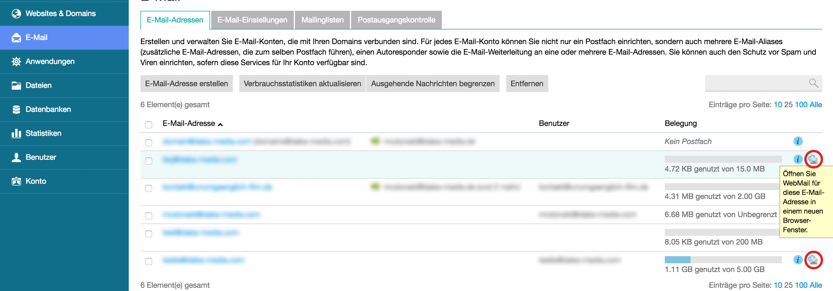 - Wenn Sie bei Plesk angemeldet sind, wählen Sie E-Mail aus und klicken Sie in der Liste der E-Mail-Adressen auf das Symbol