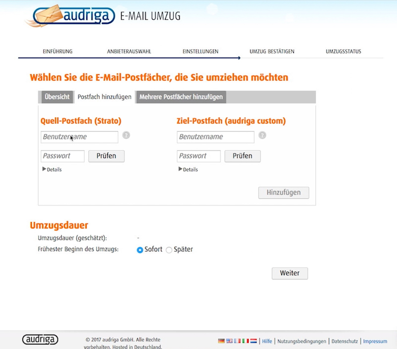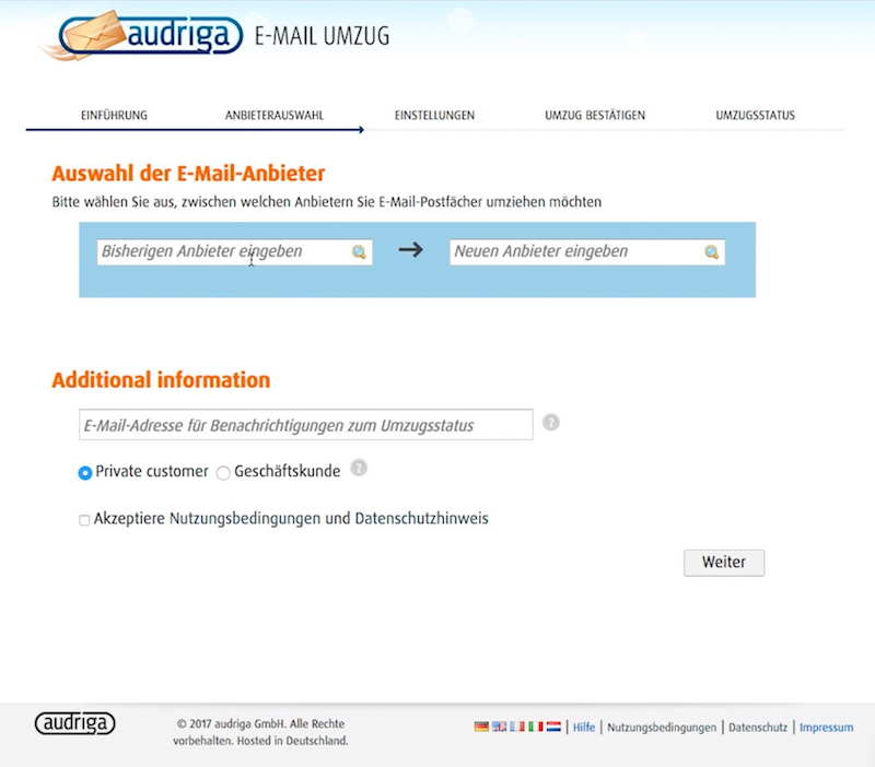 Wählen Sie Ihren Ausgangs und Zielanbieter aus die Sie nutzen möchten. Sollte Ihr Provider nicht angeboten werden wählen Sie "Anderer Anbieter". Geben Sie in diesem Zuge die Adresse ihres Mailservers an und eine E-Mail unter der Sie während des Umzugs erreichbar sein werden. Klicken Sie nun auf "Weiter".