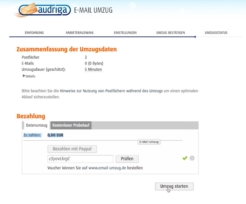 3. Im nachfolgenden Dialog können Sie nun die Zusammenfassung der Umzugsdaten einsehen. Geben Sie nun ihren Voucher Code im "Bezahlen" Feld ein und klicken danach auf "Prüfen" oder bezahlen Sie mit Paypal. Mit dem klicken auf "Umzug starten" aktivieren Sie nun den Umzug.