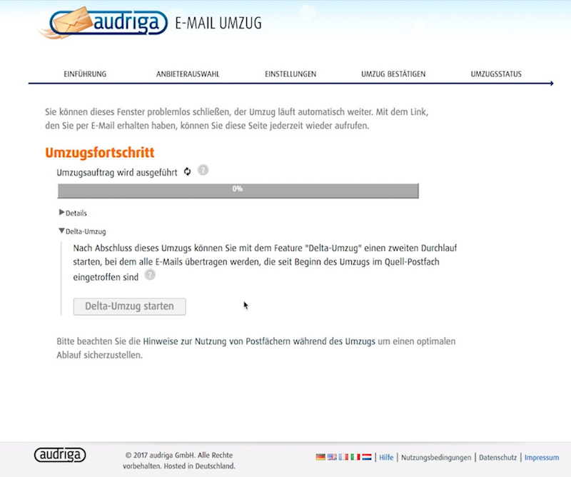 4. Folgend sehen Sie nun die Statusseite, auf welcher Sie den Fortschritt Ihres Umzuges einsehen können. Bitte geduldigen Sie sich einige Minuten bis der Umzugsstatus von "Umzugsauftrag ist startbereit" zu "Umzugsauftrag wird ausgeführt" wechselt. Bei großen Datenmengen kann der Umzug einige Stunden dauern. Nach dem Einrichten, sowie Starten und der Beendigung des Umzuges erhalten Sie jeweils eine E-Mail an die Adresse die Sie zu Beginn des Umzugs angegeben haben. In dieser E-Mail befindet sich ein Link, mit dem Sie jederzeit wieder die Statusseite aufrufen können.