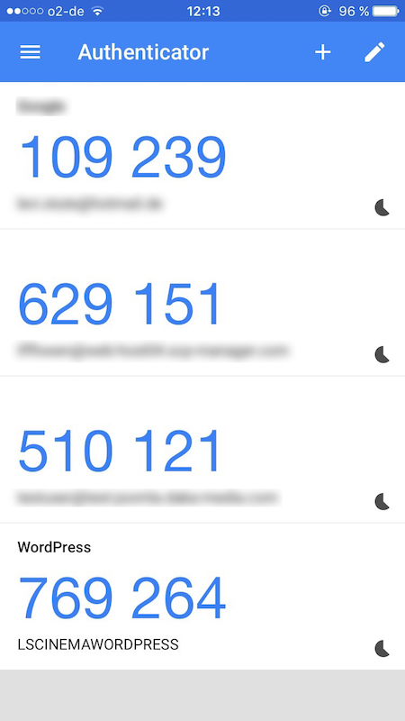 Klicken Sie dazu auf das "+" Zeichen oben rechts in der App, danach auf "Barcode scannen" und richten Sie danach die Kamera auf den QR Code auf ihrem Bildschirm. Der Code wird sofort eingelesen und in der App wird eine neue Zeile mit dem Namen ihrer Seite und sechs Zahlen entstehen.