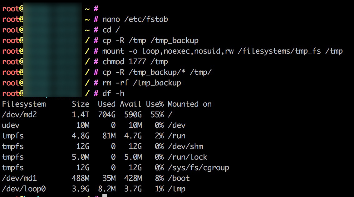 5. Jetzt noch das neue tmp Verzeichnis mit noexec, nosuis, rw Optionen mounten und die richtigen Rechte setzen: