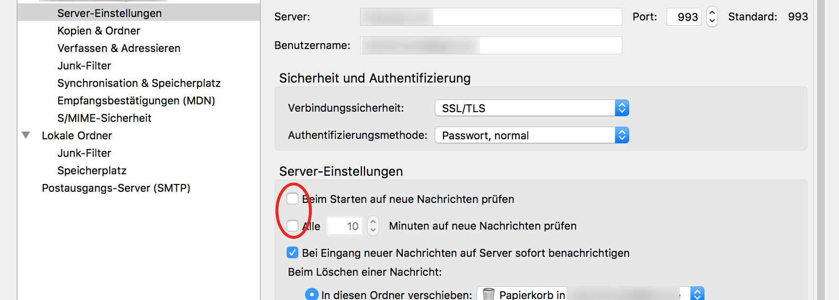 klicken Sie auf Server-Einstellungen und entfernen Sie die Häkchen bei "beim Starten auf neue Nachrichten prüfen" und bei "Alle x Minuten auf neue Nachrichten prüfen".