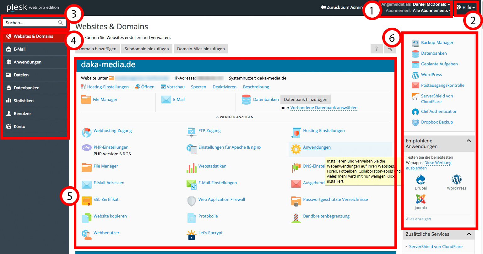 - Websites & Domains. Mit den Tools unter dieser Kategorie können Kunden Domains, Subdomains und Domain-Aliases hinzufügen und entfernen. Genauso können sie diverse Webhosting-Einstellungen verwalten, Datenbanken und Datenbankbenutzer erstellen und verwalten, ihre DNS-Einstellungen ändern, sowie ihre Websites mit SSL-Zertifikaten sichern.