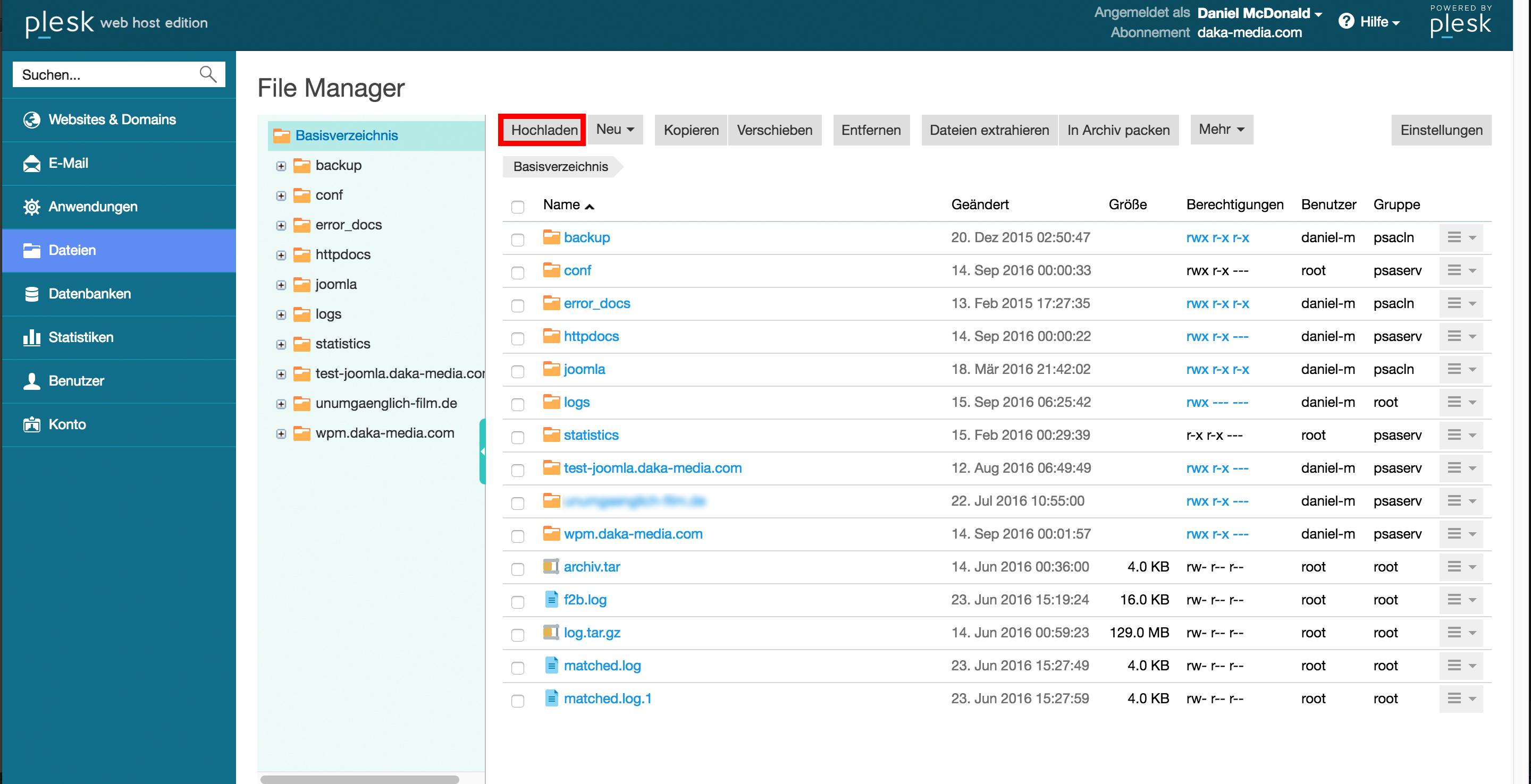 Haben Sie Ihre Website selbst programmiert oder einen Webdesigner damit beauftragt, müssen Sie den Website-Content nur noch in Plesk hochladen, bevor die Website im Internet veröffentlicht werden kann. Mit Plesk haben Sie die Option, den Content entweder über FTP oder über den integrierten File Manager hochzuladen. In den nachfolgenden Anleitungen werden beide Methoden erklärt. Sie können sich für die entscheiden, die am besten für Sie geeignet ist.