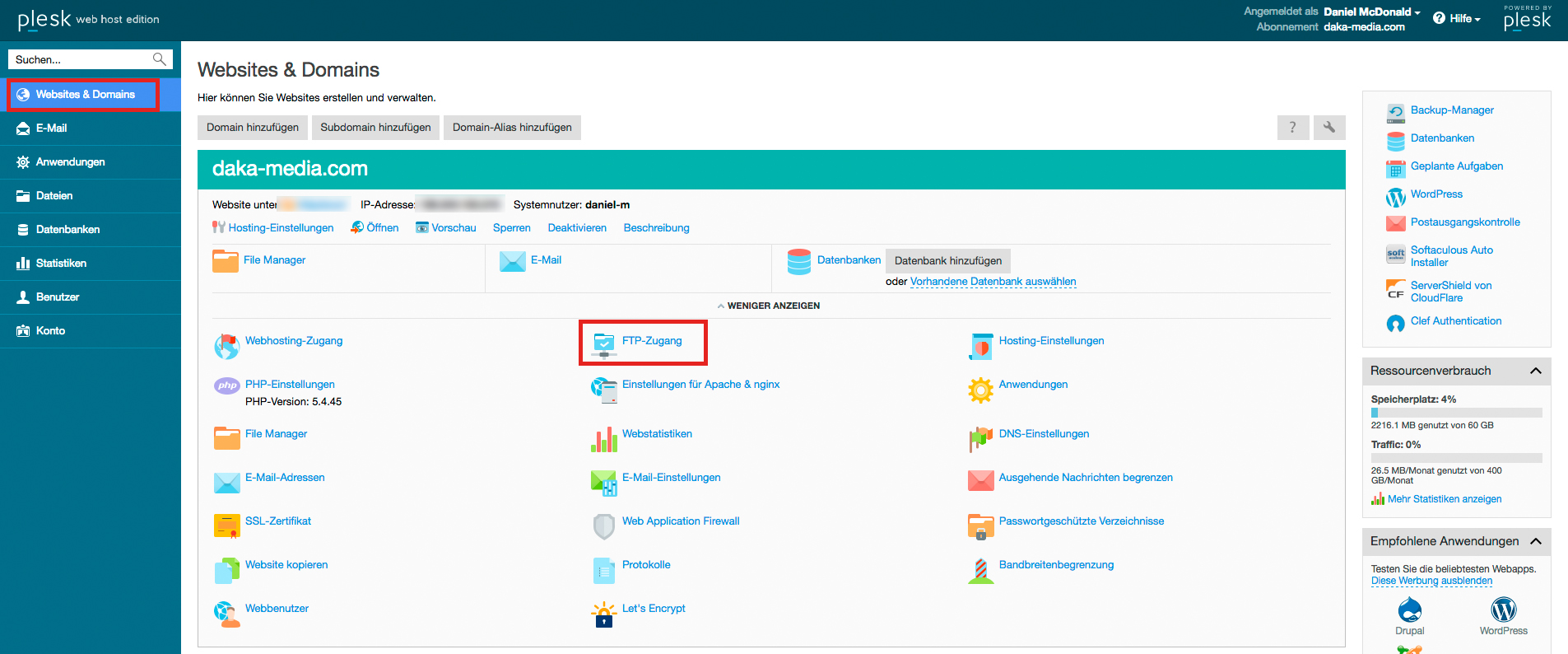 - Gehen Sie zu Websites & Domains und klicken Sie auf FTP-Zugang.