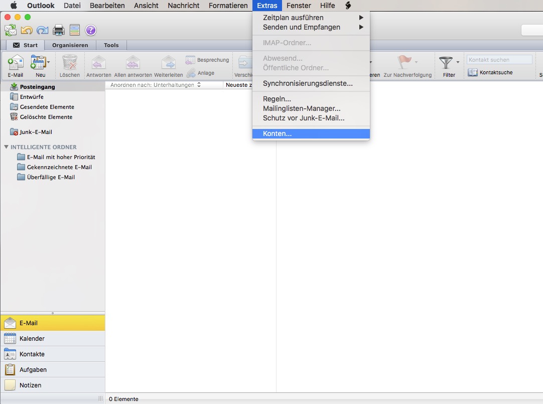 1. Beim Start von Outlook öffnet sich automatisch, falls noch kein Mailkonto existiert, der „Outlook-Setup_Assistent“. Ansonsten können Sie jenen unter „Outlook“ -> „Extras“ -> „Konten…“ aufrufen.