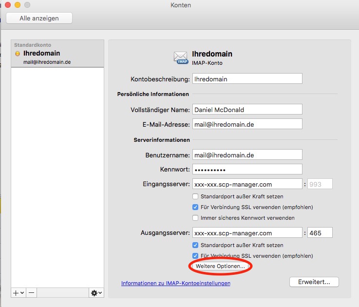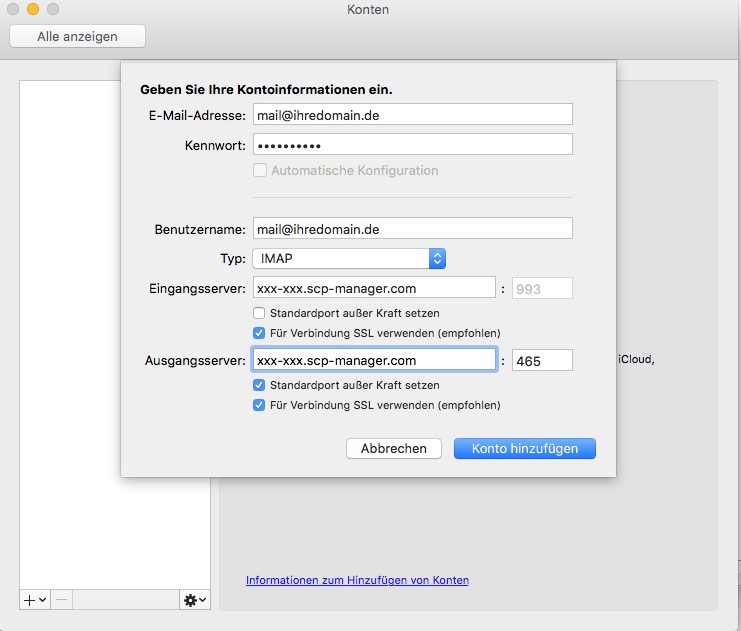4. Füllen Sie die Einträge mit Ihren Angaben aus. „mail@ihredomain.de“ ersetzen Sie mit Ihrem Domainnamen. Der Benutzername wird folgendermaßen ausgefüllt: Ihre E-Mail-Adresse (Bsp. mail@ihredomain.de) dient immer als Benutzername.
