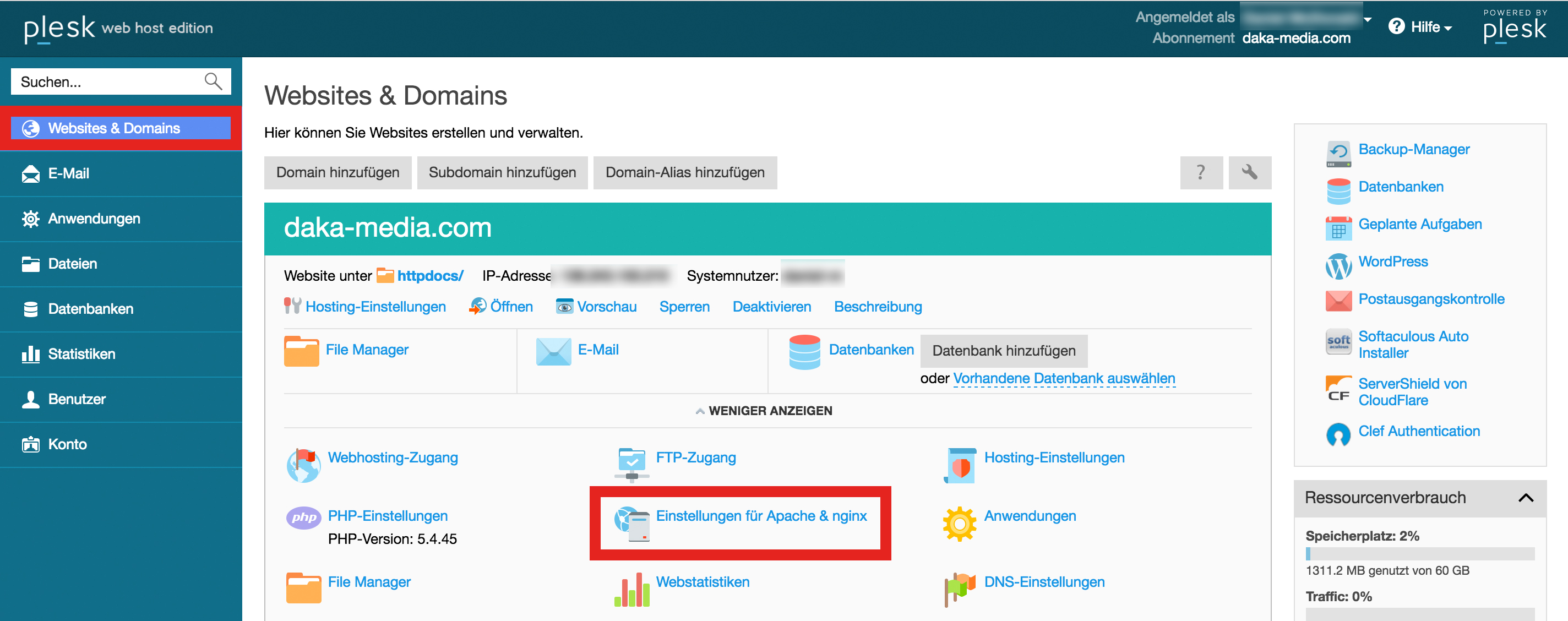 1. Gehen Sie zum Reiter Websites & Domains > Einstellungen für Apache & nginx.
