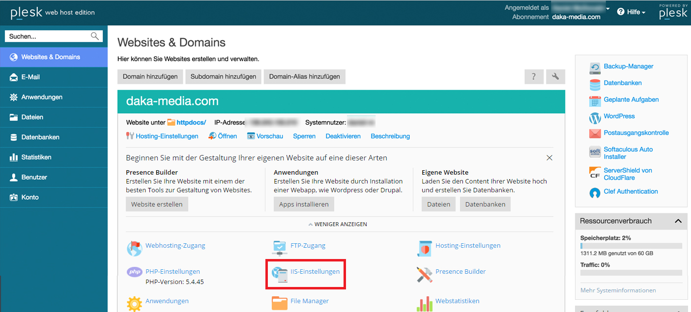 1. Gehen Sie zum Reiter Websites & Domains > IIS-Einstellungen.