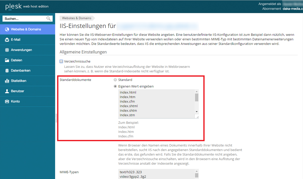 So ändern Sie die voreingestellte Indexseite in Plesk für Windows: